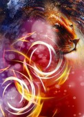 Malarstwo potężny lew głowy na tle ozdobnych i twarz mistyk kobiety ze skrzydłami motyla, kolaż komputera.