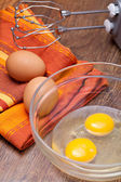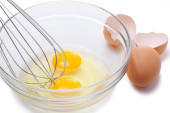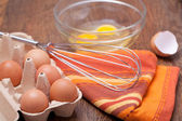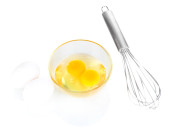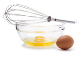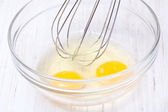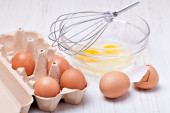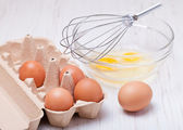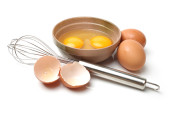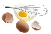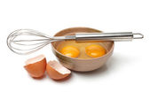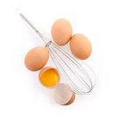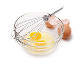 Drut trzepaczką i brązowe jaja, na białym tle.