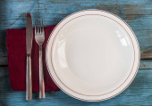 puste naczynia, nóż i widelec i zielone serwetki na stół z drewna