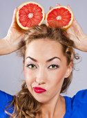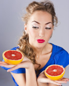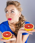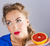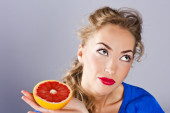 Zdjęcie "blondynka z grejpfruta, z czerwona szminka" może być wykorzystywane do celów osobistych i komercyjnych zgodnie z warunkami zakupionej licencji Royalty-free. Obraz jest dostępny do pobrania w jakości wysokiej rozdzielczości do 5760x3840.