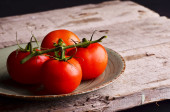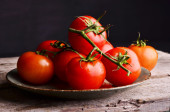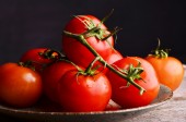 Zbliżenie świeżych, dojrzałych pomidorów wiśniowych na drewnie