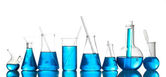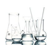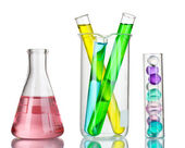 różne Naczynia laboratoryjne z kolor płynu i na białym tle odbicie