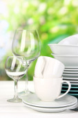 czyste naczynia na drewnianym stole na zielonym tle