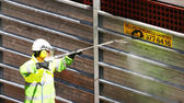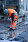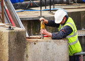 Pracownik budowlany przy użyciu przenośnych uniwersalne maszyny Obcinak do rur