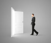 Zdjęcie "Biznesmen stoi przed ogromną drzwi" może być wykorzystywane do celów osobistych i komercyjnych zgodnie z warunkami zakupionej licencji Royalty-free. Obraz jest dostępny do pobrania w jakości wysokiej rozdzielczości do 5760x3840.