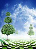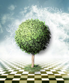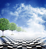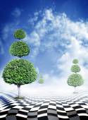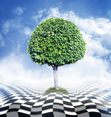 Zielone drzewo, Błękitne niebo z chmur i podłodze szachownica, złudzenie optyczne