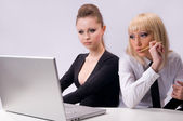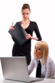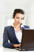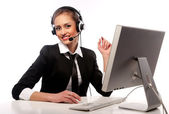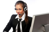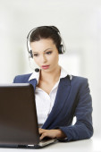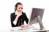 Młoda kobieta, pracy przy komputerze na białym tle