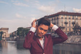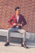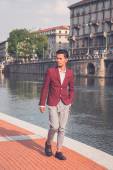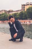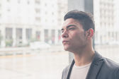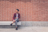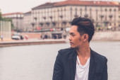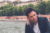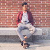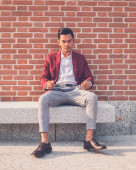 Przystojny model azjatycki siedzi na ulicach miasta