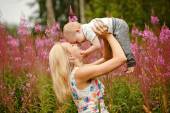 Piękna mama szczupła blondynka rzuca się śliczny uśmiechający się chłopca na tle fireweed trawy w lecie
