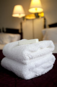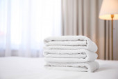 Zbliżenie czyste ręczniki i mydło w hotelu pokój higieny i gościnność koncepcja