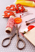 nożyczki, nici, taśmy pomiarowe i wzór na tkaniny z bliska