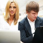 portret człowieka pewnie biznes wytłumaczyć współpracowników w biurze projektu. mnóstwo lato