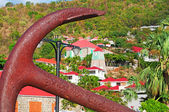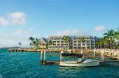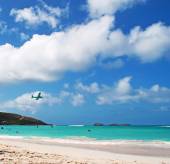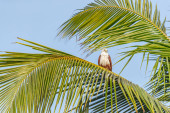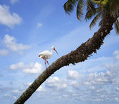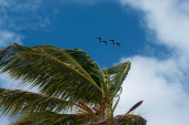 Key West: Kormoran latający na palmami plaży Higgsa, dwóch metrów długi pas piaszczystej plaży wzdłuż wybrzeża Key West