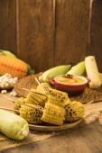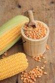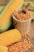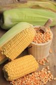 Kukurydziany kukurydzy i popcorns połączone na stole.