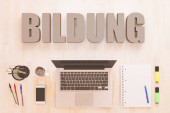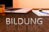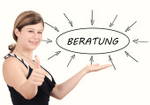 Bildung - german word for education - young businesswoman drawing information concept on transparent whiteboard in front of her.