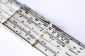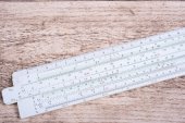 zabytkowym suwak logarytmiczny leżącego na drewnianym stole