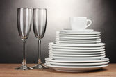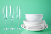 czyste talerze i szklanki na zielonym tle
