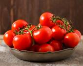 Gałąź czerwonych pomidorów leżącego w koszu na stół ciemny.