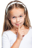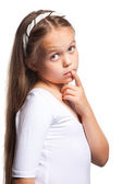 piękna dziewczyna groźby z długie blond włosy, na białym tle nad białym