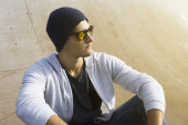 brunetka człowiek z okulary przeciwsłoneczne i kapelusz patrząc