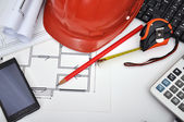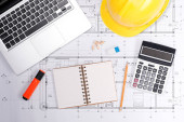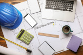 Drewna architekt biurko w wysokiej rozdzielczości z laptopa, tabletki i
