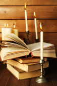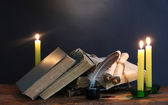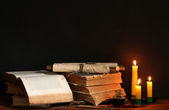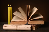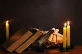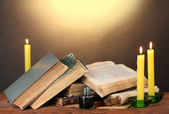 Stare książki, przewija, atrament długopis Kałamarz i świece na drewnianym stole na brązowym tle