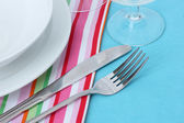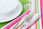 Nakrycie stołu widelcem, nożem, talerzami i serwetką