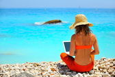 sexy piękne kobiety w bikini za pomocą laptopa na plaży
