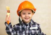 6-letni chłopiec pozowanie przez okno z żółty kask