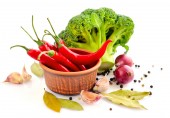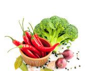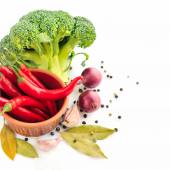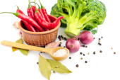 Pietruszki, ząbek czosnku, cebula, papryka i przyprawy na białym tle