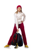 bardzo mała dziewczynka z deskorolka i telefon komórkowy, biały