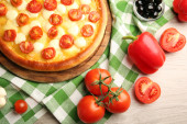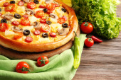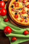 Pyszną pizzę z warzyw i mięsa na zielone serwetki, szczelnie-do góry