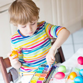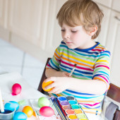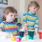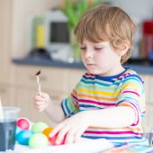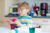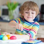 Mały chłopiec dziecko farbowanie jaj na Święta Wielkanocne