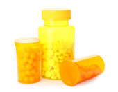 trzy żółty medycyna plastikowe butelki. na białym tle