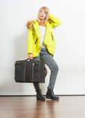 Szczęśliwa młoda kobieta w ciepła kurtka z walizką.
