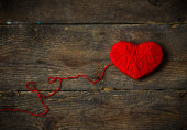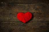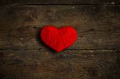 Czerwone serce kształt wykonane z wełny na stary brudny drewniane tła