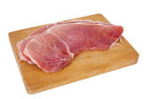 Surowy kawałek mięsa na drewnianej desce na białym tle