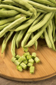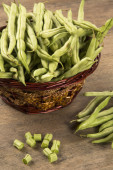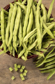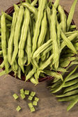 Małe i smukłe zielony groszek (fasola vert) na drewno