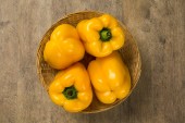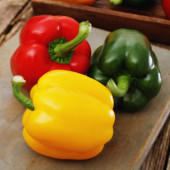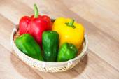 Niektóre czerwone, zielone i żółte papryki na drewnianej powierzchni
