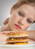Atrakcyjna dziewczyna z widelcem i nożem zżera hamburgerów