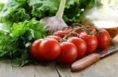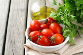 pomidory cherry, oliwy z oliwek i pietruszki na drewniane tła