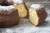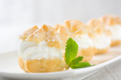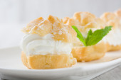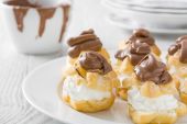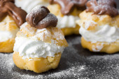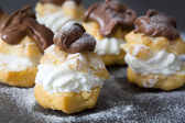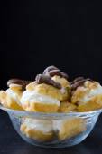 Świeży profiteroles ze śmietaną i czekoladą lukier na Łupek