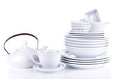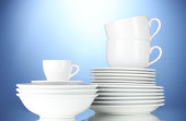 puste miski, talerze, kubki i szklanki na niebieskim tle