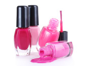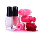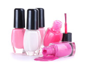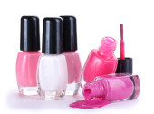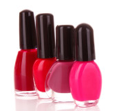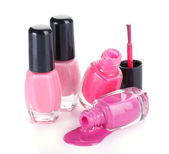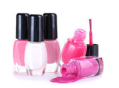 otwarte butelki z jasny lakier do paznokci na białym tle