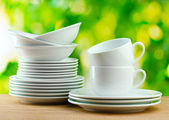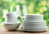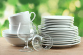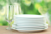czyste naczynia na drewnianym stole na zielonym tle