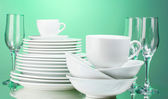 czyste naczynia na drewnianym stole na zielonym tle