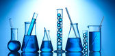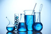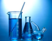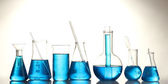 probówki z błękitnym płynem na niebieskim tle