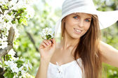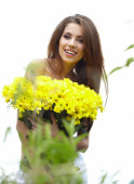 szczęśliwy uśmiechający się młoda kobieta z bukiet kwiatów