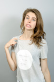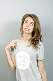 portret podkreślił, sfrustrowany szoku kobieta krzyczy na białym tle ściany szary tło.