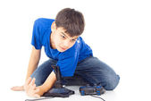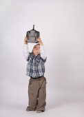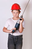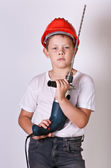 Mały chłopiec zabawka kask ochronny, pozowanie z Wiertarka na sobie. Studio strzał na białym tle na białym tle